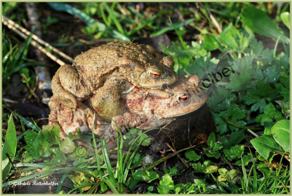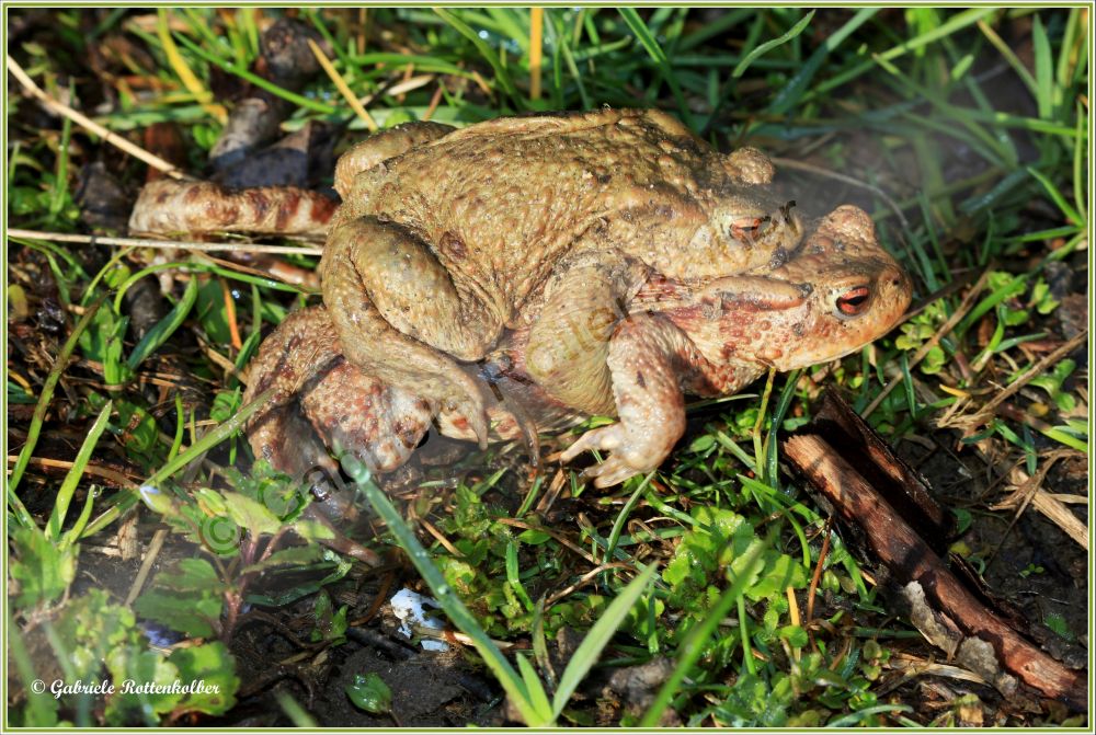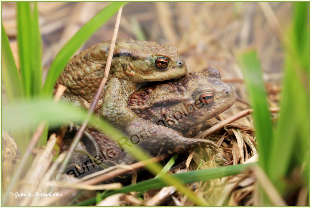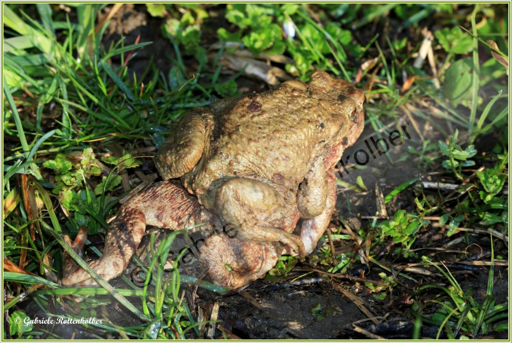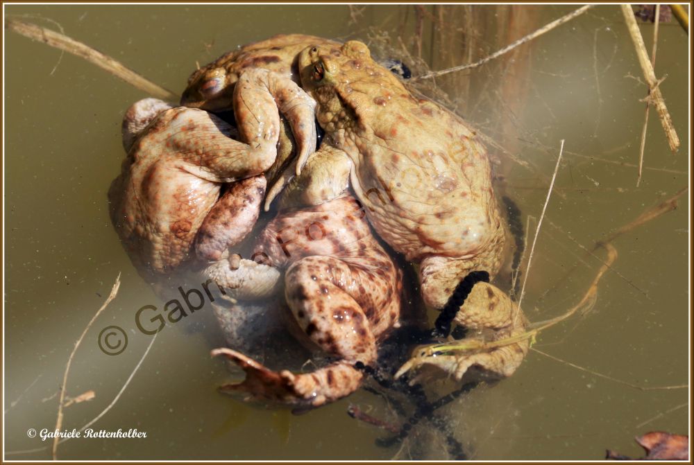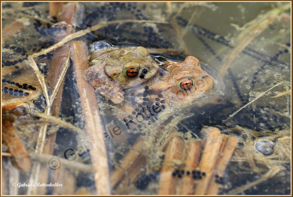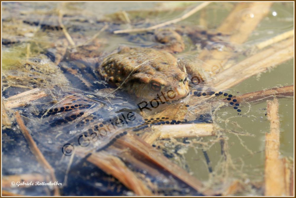 Die Erdkrötenmännchen haben keine Schallblasen. Der Laich besteht aus Schnüren die um Wasserpflanzen, Äste etc. gewickelt werden. Die Kaulquappen der Erdkröte, die oft in großen Schwärmen schwimmen, sind für Fische und Molche ungenießbar. Deshalb können Erdkröten auch Fischteiche als Laichgewässer nutzen.
