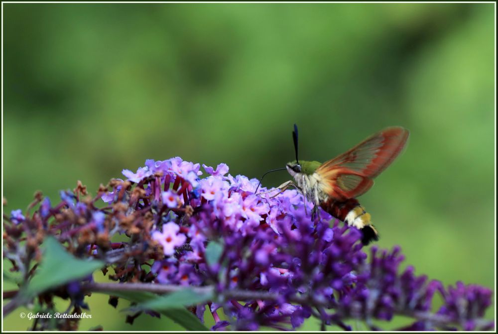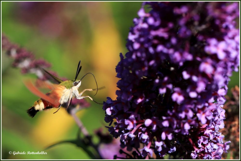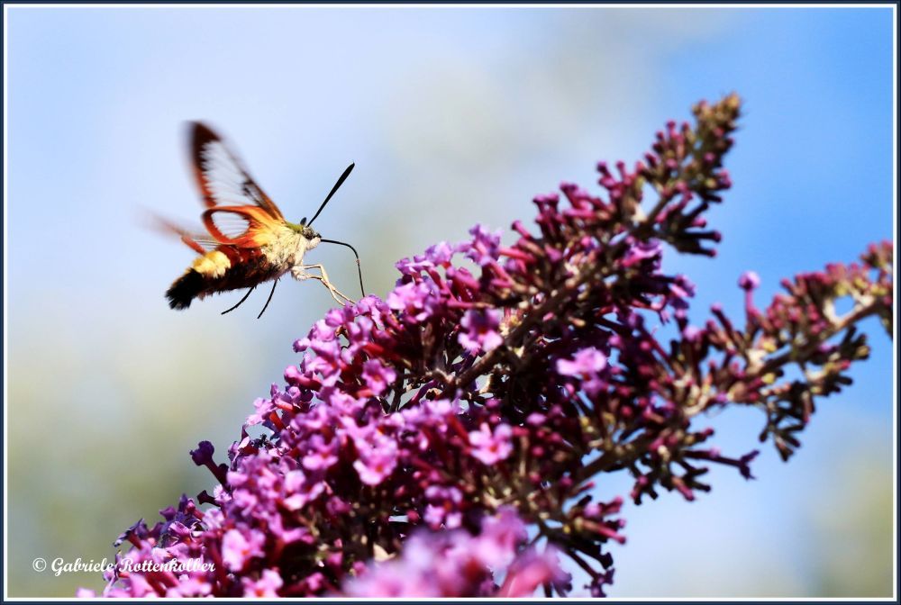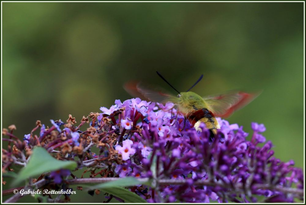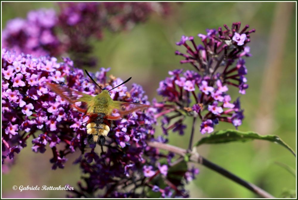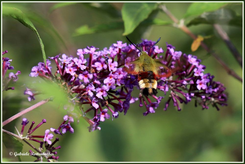 Den Hummelschwärmer fand ich erstmals und auch nur für kurze Zeit an unserem Sommerflieder. Er schwirrt wie ein Kolibri und saugt mit seinem langen Rüssel Nektar aus den Blütenkelchen von Wiesensalbei, Phlox, Schmetterlingsstrauch etc. Er liebt sonnige, grasige Wiesen, auch Waldränder, besucht aber auch Gärten und Parkanlagen. Das Weibchen legt seine Eier einzeln auf die Blattunterseiten von Geißblatt und Schneebeere. Die Raupen sind grün gefärbt und werden ca. 5 cm lang.